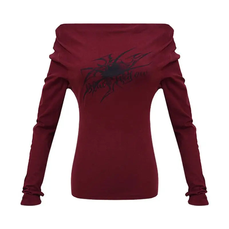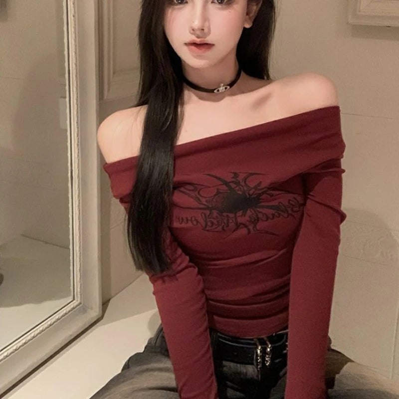 Gothic Spider Graphic Grunge T Shirts Women Y2k Off Shoulder Vintage Crop Top Korean Style Kpop Coquette Long Sleeve Tees 2024