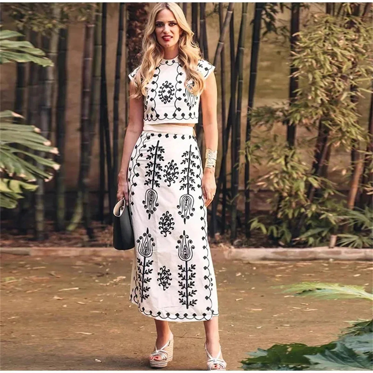 Lady Beach Holiday Dress Embroidered Print Top Skirt Two Piece Set Shoulder Padded Sleeveless Crop Top Lace Up Skirt Suit Outfit