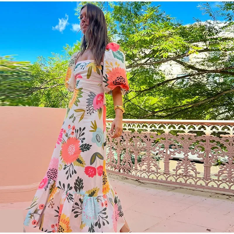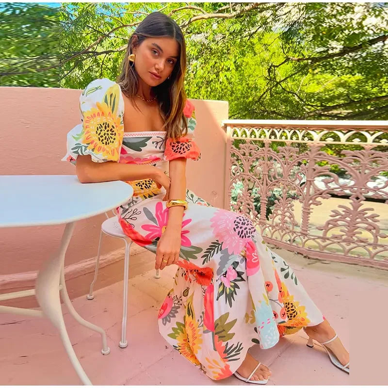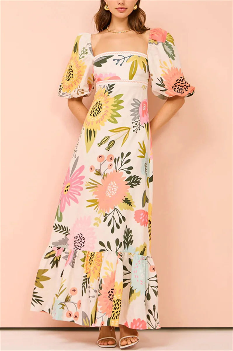 Women Elegant Printed Square Neck Maxi Dress Summer Fashion Short Lantern Sleeve A-line Dresses Female New Vacation Street Robes