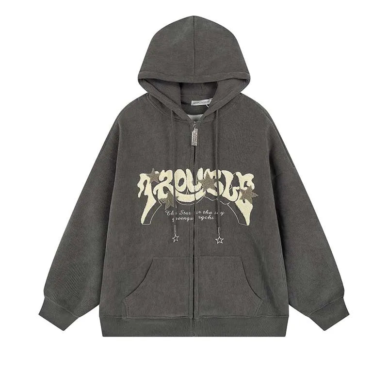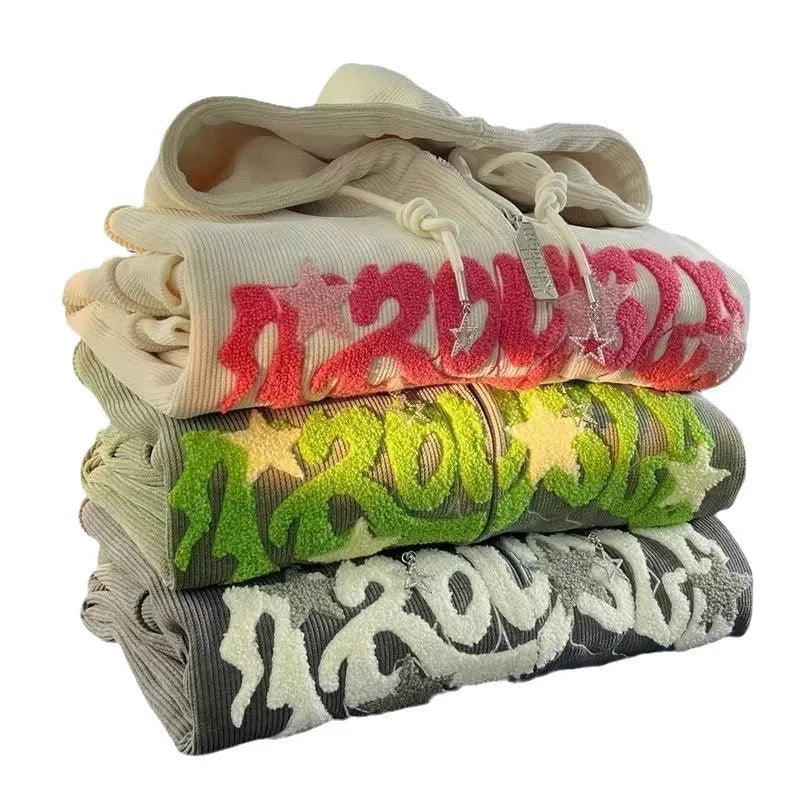 Y2k Zip Up Hoodie Women Autumn Retro Embroidered Letter Loose Long Sleeve Tops 2025 Casual Hooded Sweatshirts Harajuku Jackets